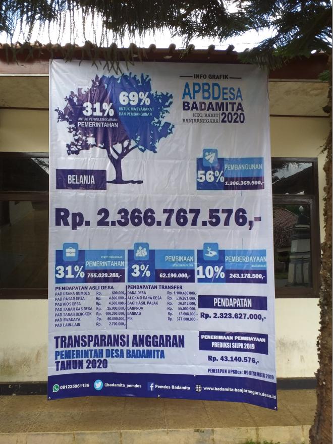Pemerintah Desa Badamita Kecamatan Rakit mempublikasikan pengelolaan anggaran APBDes tahun 2020 melalui papan transparansi atau baliho yang berukuran besar di kantor desa Badamita.