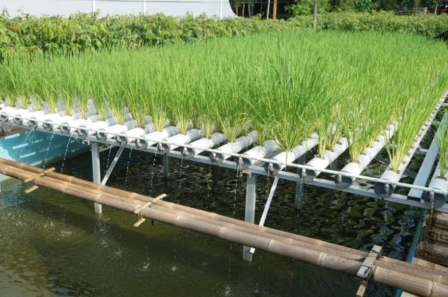 Tanaman padi ditanam di dalam cup plastik kompos dan sekam bakar, diletakkan di pipa-pipa paralon yang teraliri air dan nutrisi dari sumber air kolam ikan.
