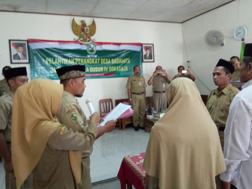 Setelah pelaksaan ujian tertulis seleksi penyaringan perangkat desa untuk jabatan Kepala Dusun IV Sokaraja dilaksanakan dengan hasil akhir saudara Isfiyanto ditetapkan sebagai rangking 1 ujian tertulis, maka dilaksanaka Pelantikan Kepala Dusun IV Sokaraja pada hari senin, 1 april 2019 di Aula Desa Badamita.